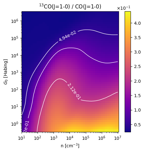 13CO(J=1-0) / CO(J=1-0) Intensity Ratio emitted from the surface of a PDR as a function of the cloud density n and the FUV flux incident on the cloud G0. The above model is at a viewing angle of i=0 degrees, where i=0 is face-on. The models in the wk2020 ModelSet are based on Kaufman et al. 2006 , Wolfire et al. 2010, and Neufeld & Wolfire 2016. They use these parameters. More details are in the FITS headers.
