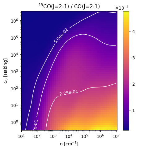 13CO(J=2-1) / CO(J=2-1) Intensity Ratio emitted from the surface of a PDR as a function of the cloud density n and the FUV flux incident on the cloud G0. The above model is at a viewing angle of i=0 degrees, where i=0 is face-on. The models in the wk2020 ModelSet are based on Kaufman et al. 2006 , Wolfire et al. 2010, and Neufeld & Wolfire 2016. They use these parameters. More details are in the FITS headers.