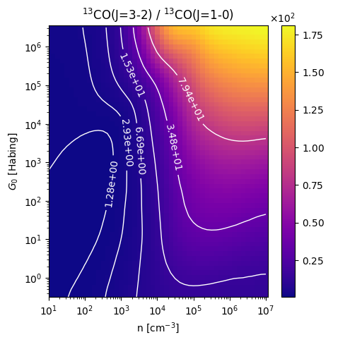 13CO(J=3-2) / 13CO(J=1-0) Intensity Ratio emitted from the surface of a PDR as a function of the cloud density n and the FUV flux incident on the cloud G0. The above model is at a viewing angle of i=0 degrees, where i=0 is face-on. The models in the wk2020 ModelSet are based on Kaufman et al. 2006 , Wolfire et al. 2010, and Neufeld & Wolfire 2016. They use these parameters. More details are in the FITS headers.