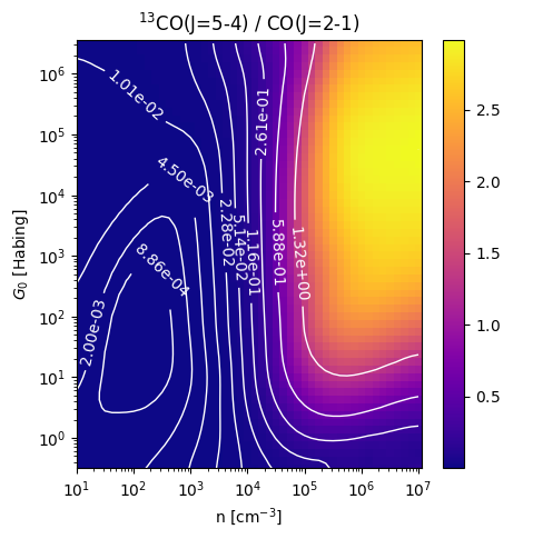 13CO(J=5-4) / CO(J=2-1) Intensity Ratio emitted from the surface of a PDR as a function of the cloud density n and the FUV flux incident on the cloud G0. The above model is at a viewing angle of i=0 degrees, where i=0 is face-on. The models in the wk2020 ModelSet are based on Kaufman et al. 2006 , Wolfire et al. 2010, and Neufeld & Wolfire 2016. They use these parameters. More details are in the FITS headers.