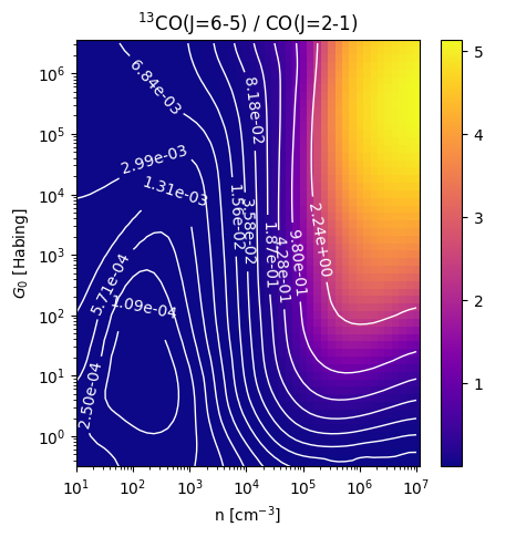 13CO(J=6-5) / CO(J=2-1) Intensity Ratio emitted from the surface of a PDR as a function of the cloud density n and the FUV flux incident on the cloud G0. The above model is at a viewing angle of i=0 degrees, where i=0 is face-on. The models in the wk2020 ModelSet are based on Kaufman et al. 2006 , Wolfire et al. 2010, and Neufeld & Wolfire 2016. They use these parameters. More details are in the FITS headers.