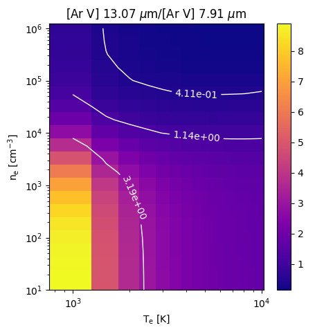 [Ar V] 13.07 µm/[Ar V] 7.91 µm Emissivity Ratio emitted from the ionized gas layer of a PDR as a function of the electron gas temperature Te and electron density ne. We assume that the line emission is in the optically thin limit so that the ratio of emissivities is given by the ratio of volume emissivity. For \({\rm Ar^{+2}}\) , and \({\rm Ar^{+4}}\) , we use CHIANTI ( Dere et al (1997); DelZanna et al. (2022)) using the default values for the A values and collision strengths. For \({\rm Fe^+}\) we substituted the default values in CHIANTI with Einstein A values from Deb & Hibbert (2011) and collision strengths from Smyth et al. (2019) . The emissivity ratios are found in the temperature range from \(T_e=10^3\) K to \(10^4\) K, and the density range from \(n_e = 10^2~{\rm cm^{-3}}\) to \(10^6~{\rm cm^{-3}}\).