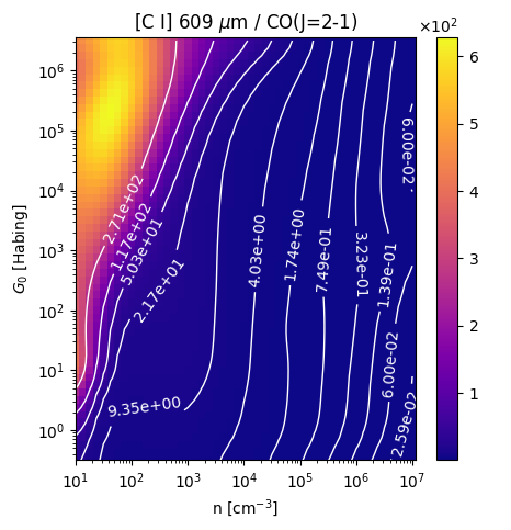 [C I] 609 µm / CO(J=2-1) Intensity Ratio emitted from the surface of a PDR as a function of the cloud density n and the FUV flux incident on the cloud G0. The above model is at a viewing angle of i=0 degrees, where i=0 is face-on. The models in the wk2020 ModelSet are based on Kaufman et al. 2006 , Wolfire et al. 2010, and Neufeld & Wolfire 2016. They use these parameters. More details are in the FITS headers.