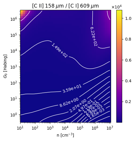 [C II] 158 µm / [C I] 609 µm Intensity Ratio emitted from the surface of a PDR as a function of the cloud density n and the FUV flux incident on the cloud G0. The above model is at a viewing angle of i=0 degrees, where i=0 is face-on. The models in the wk2020 ModelSet are based on Kaufman et al. 2006 , Wolfire et al. 2010, and Neufeld & Wolfire 2016. They use these parameters. More details are in the FITS headers.