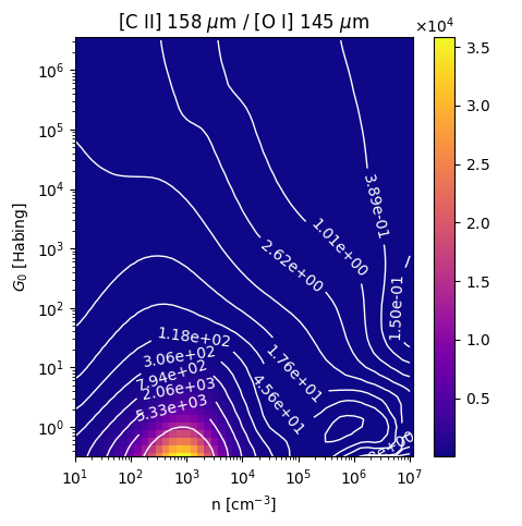 [C II] 158 µm / [O I] 145 µm Intensity Ratio emitted from the surface of a PDR as a function of the cloud density n and the FUV flux incident on the cloud G0. The above model is at a viewing angle of i=0 degrees, where i=0 is face-on. The models in the wk2020 ModelSet are based on Kaufman et al. 2006 , Wolfire et al. 2010, and Neufeld & Wolfire 2016. They use these parameters. More details are in the FITS headers.