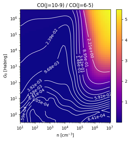 CO(J=10-9) / CO(J=6-5) Intensity Ratio emitted from the surface of a PDR as a function of the cloud density n and the FUV flux incident on the cloud G0. The above model is at a viewing angle of i=0 degrees, where i=0 is face-on. The models in the wk2020 ModelSet are based on Kaufman et al. 2006 , Wolfire et al. 2010, and Neufeld & Wolfire 2016. They use these parameters. More details are in the FITS headers.