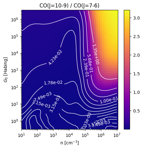 CO(J=10-9) / CO(J=7-6) Intensity Ratio emitted from the surface of a PDR as a function of the cloud density n and the FUV flux incident on the cloud G0. The above model is at a viewing angle of i=0 degrees, where i=0 is face-on. The models in the wk2020 ModelSet are based on Kaufman et al. 2006 , Wolfire et al. 2010, and Neufeld & Wolfire 2016. They use these parameters. More details are in the FITS headers.