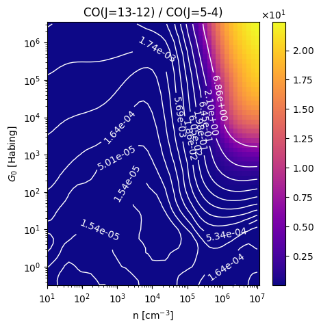 CO(J=13-12) / CO(J=5-4) Intensity Ratio emitted from the surface of a PDR as a function of the cloud density n and the FUV flux incident on the cloud G0. The above model is at a viewing angle of i=0 degrees, where i=0 is face-on. The models in the wk2020 ModelSet are based on Kaufman et al. 2006 , Wolfire et al. 2010, and Neufeld & Wolfire 2016. They use these parameters. More details are in the FITS headers.