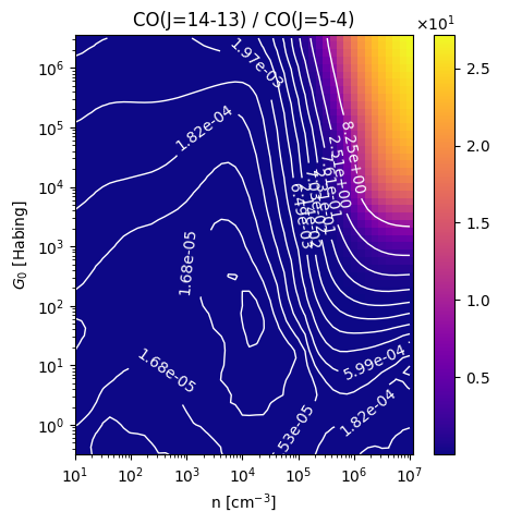 CO(J=14-13) / CO(J=5-4) Intensity Ratio emitted from the surface of a PDR as a function of the cloud density n and the FUV flux incident on the cloud G0. The above model is at a viewing angle of i=0 degrees, where i=0 is face-on. The models in the wk2020 ModelSet are based on Kaufman et al. 2006 , Wolfire et al. 2010, and Neufeld & Wolfire 2016. They use these parameters. More details are in the FITS headers.