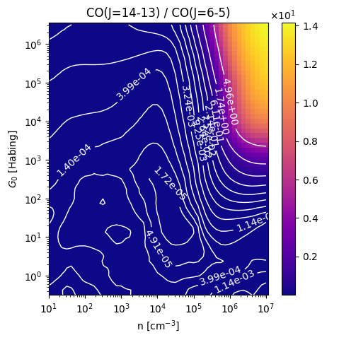 CO(J=14-13) / CO(J=6-5) Intensity Ratio emitted from the surface of a PDR as a function of the cloud density n and the FUV flux incident on the cloud G0. The above model is at a viewing angle of i=0 degrees, where i=0 is face-on. The models in the wk2020 ModelSet are based on Kaufman et al. 2006 , Wolfire et al. 2010, and Neufeld & Wolfire 2016. They use these parameters. More details are in the FITS headers.