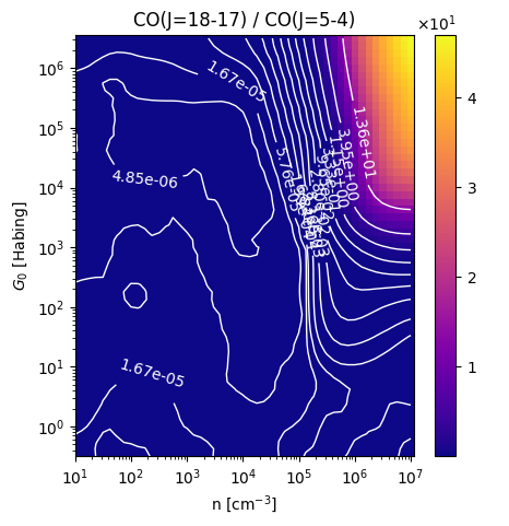 CO(J=18-17) / CO(J=5-4) Intensity Ratio emitted from the surface of a PDR as a function of the cloud density n and the FUV flux incident on the cloud G0. The above model is at a viewing angle of i=0 degrees, where i=0 is face-on. The models in the wk2020 ModelSet are based on Kaufman et al. 2006 , Wolfire et al. 2010, and Neufeld & Wolfire 2016. They use these parameters. More details are in the FITS headers.