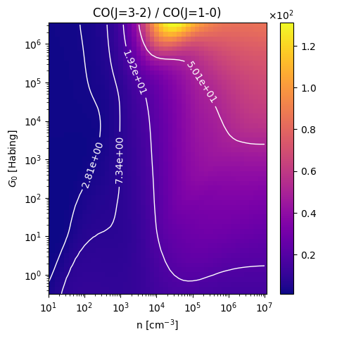 CO(J=3-2) / CO(J=1-0) Intensity Ratio emitted from the surface of a PDR as a function of the cloud density n and the FUV flux incident on the cloud G0. The above model is at a viewing angle of i=0 degrees, where i=0 is face-on. The models in the wk2020 ModelSet are based on Kaufman et al. 2006 , Wolfire et al. 2010, and Neufeld & Wolfire 2016. They use these parameters. More details are in the FITS headers.