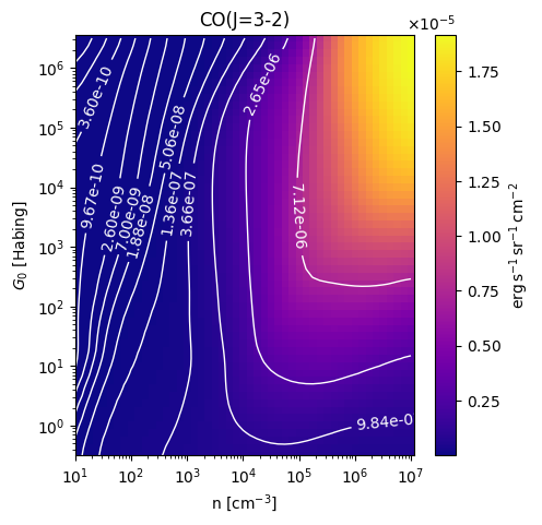 CO(J=3-2) Intensity emitted from the surface of a PDR as a function of the cloud density n and the FUV flux incident on the cloud G0. The above model is at a viewing angle of i=0 degrees, where i=0 is face-on. The models in the wk2020 ModelSet are based on Kaufman et al. 2006 , Wolfire et al. 2010, and Neufeld & Wolfire 2016. They use these parameters. More details are in the FITS headers.