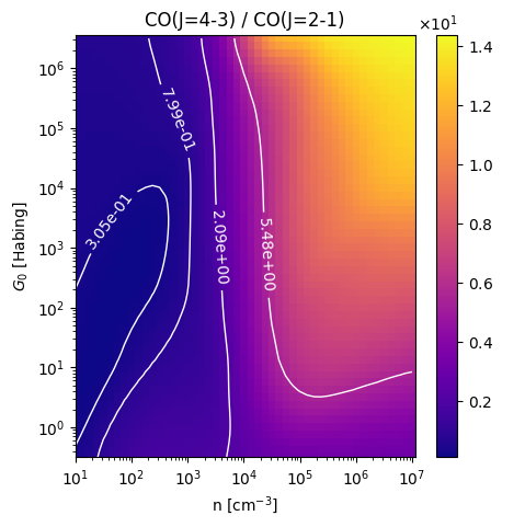 CO(J=4-3) / CO(J=2-1) Intensity Ratio emitted from the surface of a PDR as a function of the cloud density n and the FUV flux incident on the cloud G0. The above model is at a viewing angle of i=0 degrees, where i=0 is face-on. The models in the wk2020 ModelSet are based on Kaufman et al. 2006 , Wolfire et al. 2010, and Neufeld & Wolfire 2016. They use these parameters. More details are in the FITS headers.