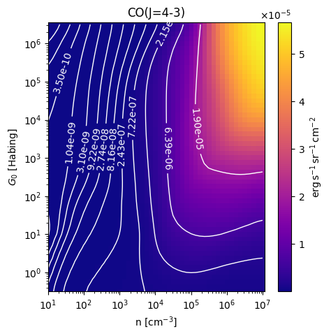 CO(J=4-3) Intensity emitted from the surface of a PDR as a function of the cloud density n and the FUV flux incident on the cloud G0. The above model is at a viewing angle of i=0 degrees, where i=0 is face-on. The models in the wk2020 ModelSet are based on Kaufman et al. 2006 , Wolfire et al. 2010, and Neufeld & Wolfire 2016. They use these parameters. More details are in the FITS headers.