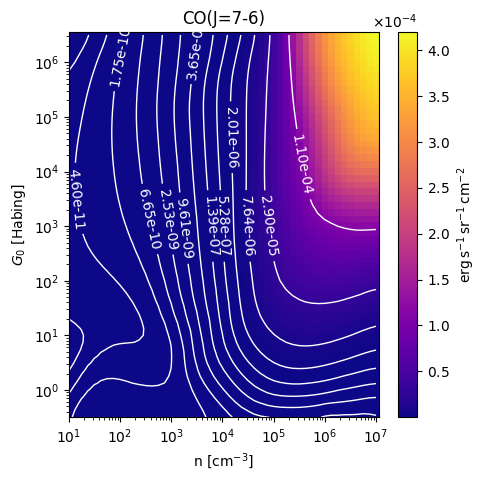 CO(J=7-6) Intensity emitted from the surface of a PDR as a function of the cloud density n and the FUV flux incident on the cloud G0. The above model is at a viewing angle of i=0 degrees, where i=0 is face-on. The models in the wk2020 ModelSet are based on Kaufman et al. 2006 , Wolfire et al. 2010, and Neufeld & Wolfire 2016. They use these parameters. More details are in the FITS headers.