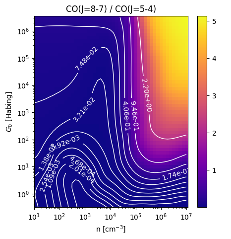 CO(J=8-7) / CO(J=5-4) Intensity Ratio emitted from the surface of a PDR as a function of the cloud density n and the FUV flux incident on the cloud G0. The above model is at a viewing angle of i=0 degrees, where i=0 is face-on. The models in the wk2020 ModelSet are based on Kaufman et al. 2006 , Wolfire et al. 2010, and Neufeld & Wolfire 2016. They use these parameters. More details are in the FITS headers.