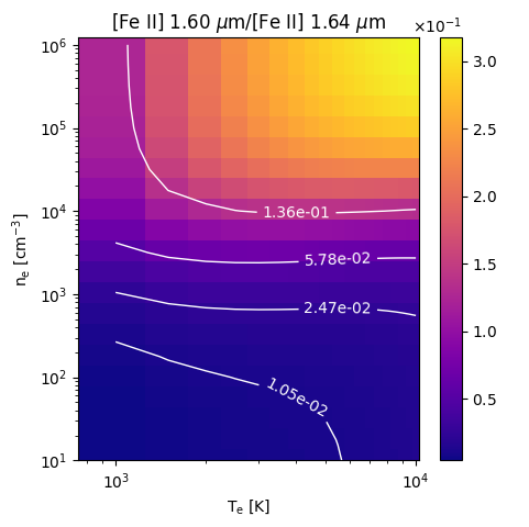 [Fe II] 1.60 µm/[Fe II] 1.64 µm Emissivity Ratio emitted from the ionized gas layer of a PDR as a function of the electron gas temperature Te and electron density ne. We assume that the line emission is in the optically thin limit so that the ratio of emissivities is given by the ratio of volume emissivity. For \({\rm Ar^{+2}}\) , and \({\rm Ar^{+4}}\) , we use CHIANTI ( Dere et al (1997); DelZanna et al. (2022)) using the default values for the A values and collision strengths. For \({\rm Fe^+}\) we substituted the default values in CHIANTI with Einstein A values from Deb & Hibbert (2011) and collision strengths from Smyth et al. (2019) . The emissivity ratios are found in the temperature range from \(T_e=10^3\) K to \(10^4\) K, and the density range from \(n_e = 10^2~{\rm cm^{-3}}\) to \(10^6~{\rm cm^{-3}}\).
