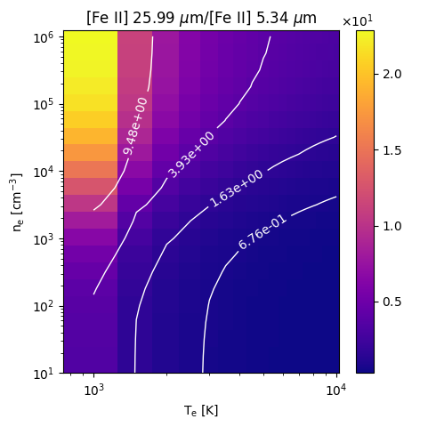 [Fe II] 25.99 µm/[Fe II] 5.34 µm Emissivity Ratio emitted from the ionized gas layer of a PDR as a function of the electron gas temperature Te and electron density ne. We assume that the line emission is in the optically thin limit so that the ratio of emissivities is given by the ratio of volume emissivity. For \({\rm Ar^{+2}}\) , and \({\rm Ar^{+4}}\) , we use CHIANTI ( Dere et al (1997); DelZanna et al. (2022)) using the default values for the A values and collision strengths. For \({\rm Fe^+}\) we substituted the default values in CHIANTI with Einstein A values from Deb & Hibbert (2011) and collision strengths from Smyth et al. (2019) . The emissivity ratios are found in the temperature range from \(T_e=10^3\) K to \(10^4\) K, and the density range from \(n_e = 10^2~{\rm cm^{-3}}\) to \(10^6~{\rm cm^{-3}}\).