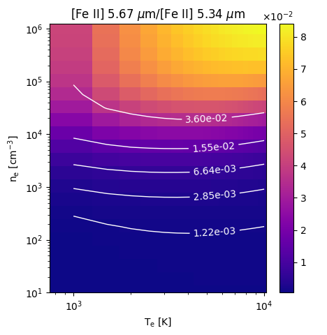 [Fe II] 5.67 µm/[Fe II] 5.34 µm Emissivity Ratio emitted from the ionized gas layer of a PDR as a function of the electron gas temperature Te and electron density ne. We assume that the line emission is in the optically thin limit so that the ratio of emissivities is given by the ratio of volume emissivity. For \({\rm Ar^{+2}}\) , and \({\rm Ar^{+4}}\) , we use CHIANTI ( Dere et al (1997); DelZanna et al. (2022)) using the default values for the A values and collision strengths. For \({\rm Fe^+}\) we substituted the default values in CHIANTI with Einstein A values from Deb & Hibbert (2011) and collision strengths from Smyth et al. (2019) . The emissivity ratios are found in the temperature range from \(T_e=10^3\) K to \(10^4\) K, and the density range from \(n_e = 10^2~{\rm cm^{-3}}\) to \(10^6~{\rm cm^{-3}}\).