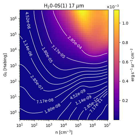 H20-0S(1) 17 µm Intensity emitted from the surface of a PDR as a function of the cloud density n and the FUV flux incident on the cloud G0. The above model is at a viewing angle of i=0 degrees, where i=0 is face-on. The models in the wk2020 ModelSet are based on Kaufman et al. 2006 , Wolfire et al. 2010, and Neufeld & Wolfire 2016. They use these parameters. More details are in the FITS headers.