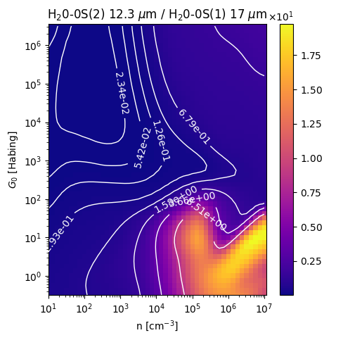 H20-0S(2) 12.3 µm / H20-0S(1) 17 µm Intensity Ratio emitted from the surface of a PDR as a function of the cloud density n and the FUV flux incident on the cloud G0. The above model is at a viewing angle of i=0 degrees, where i=0 is face-on. The models in the wk2020 ModelSet are based on Kaufman et al. 2006 , Wolfire et al. 2010, and Neufeld & Wolfire 2016. They use these parameters. More details are in the FITS headers.