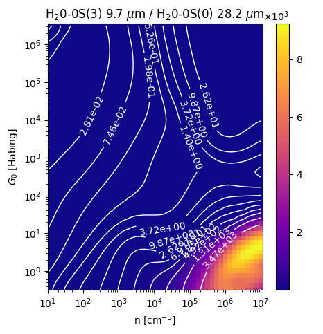 H20-0S(3) 9.7 µm / H20-0S(0) 28.2 µm Intensity Ratio emitted from the surface of a PDR as a function of the cloud density n and the FUV flux incident on the cloud G0. The above model is at a viewing angle of i=0 degrees, where i=0 is face-on. The models in the wk2020 ModelSet are based on Kaufman et al. 2006 , Wolfire et al. 2010, and Neufeld & Wolfire 2016. They use these parameters. More details are in the FITS headers.