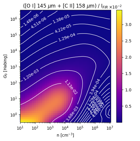 ([O I] 145 µm + [C II] 158 µm) / IFIR Intensity Ratio emitted from the surface of a PDR as a function of the cloud density n and the FUV flux incident on the cloud G0. The above model is at a viewing angle of i=0 degrees, where i=0 is face-on. The models in the wk2020 ModelSet are based on Kaufman et al. 2006 , Wolfire et al. 2010, and Neufeld & Wolfire 2016. They use these parameters. More details are in the FITS headers.