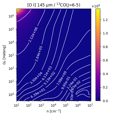 [O I] 145 µm / 13CO(J=6-5) Intensity Ratio emitted from the surface of a PDR as a function of the cloud density n and the FUV flux incident on the cloud G0. The above model is at a viewing angle of i=0 degrees, where i=0 is face-on. The models in the wk2020 ModelSet are based on Kaufman et al. 2006 , Wolfire et al. 2010, and Neufeld & Wolfire 2016. They use these parameters. More details are in the FITS headers.