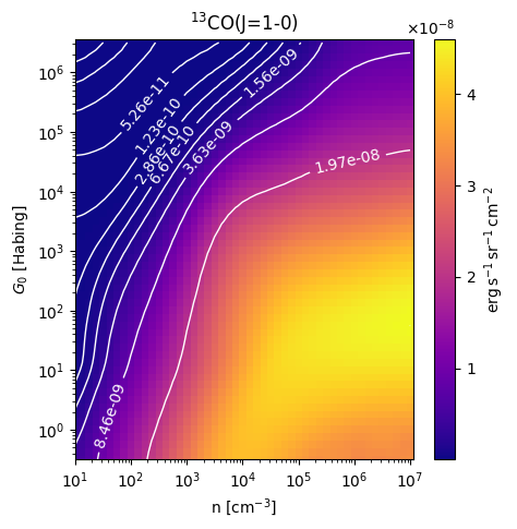 13CO(J=1-0) Intensity emitted from the surface of a PDR as a function of the cloud density n and the FUV flux incident on the cloud G0. The above model is at a viewing angle of i=30 degrees, where i=0 is face-on. The models in the wk2020 ModelSet are based on Kaufman et al. 2006 , Wolfire et al. 2010, and Neufeld & Wolfire 2016. They use these parameters. More details are in the FITS headers.