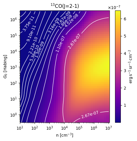13CO(J=2-1) Intensity emitted from the surface of a PDR as a function of the cloud density n and the FUV flux incident on the cloud G0. The above model is at a viewing angle of i=30 degrees, where i=0 is face-on. The models in the wk2020 ModelSet are based on Kaufman et al. 2006 , Wolfire et al. 2010, and Neufeld & Wolfire 2016. They use these parameters. More details are in the FITS headers.