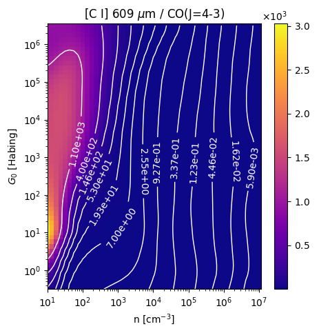 [C I] 609 µm / CO(J=4-3) Intensity Ratio emitted from the surface of a PDR as a function of the cloud density n and the FUV flux incident on the cloud G0. The above model is at a viewing angle of i=30 degrees, where i=0 is face-on. The models in the wk2020 ModelSet are based on Kaufman et al. 2006 , Wolfire et al. 2010, and Neufeld & Wolfire 2016. They use these parameters. More details are in the FITS headers.