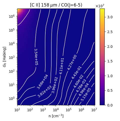 [C II] 158 µm / CO(J=6-5) Intensity Ratio emitted from the surface of a PDR as a function of the cloud density n and the FUV flux incident on the cloud G0. The above model is at a viewing angle of i=30 degrees, where i=0 is face-on. The models in the wk2020 ModelSet are based on Kaufman et al. 2006 , Wolfire et al. 2010, and Neufeld & Wolfire 2016. They use these parameters. More details are in the FITS headers.