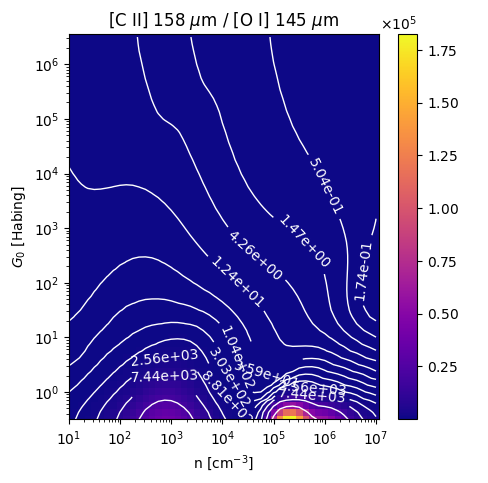 [C II] 158 µm / [O I] 145 µm Intensity Ratio emitted from the surface of a PDR as a function of the cloud density n and the FUV flux incident on the cloud G0. The above model is at a viewing angle of i=30 degrees, where i=0 is face-on. The models in the wk2020 ModelSet are based on Kaufman et al. 2006 , Wolfire et al. 2010, and Neufeld & Wolfire 2016. They use these parameters. More details are in the FITS headers.
