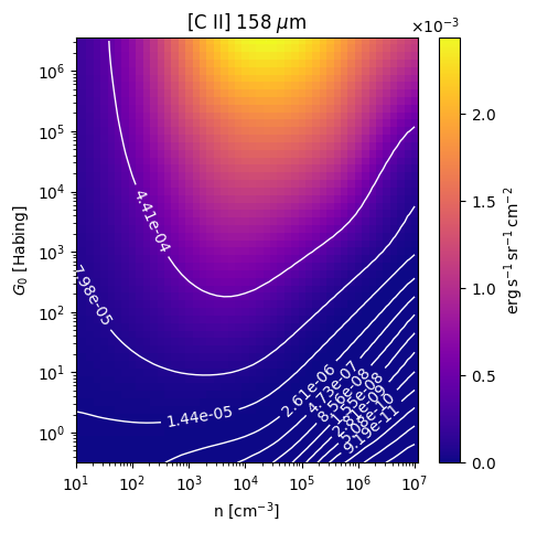 [C II] 158 µm Intensity emitted from the surface of a PDR as a function of the cloud density n and the FUV flux incident on the cloud G0. The above model is at a viewing angle of i=30 degrees, where i=0 is face-on. The models in the wk2020 ModelSet are based on Kaufman et al. 2006 , Wolfire et al. 2010, and Neufeld & Wolfire 2016. They use these parameters. More details are in the FITS headers.