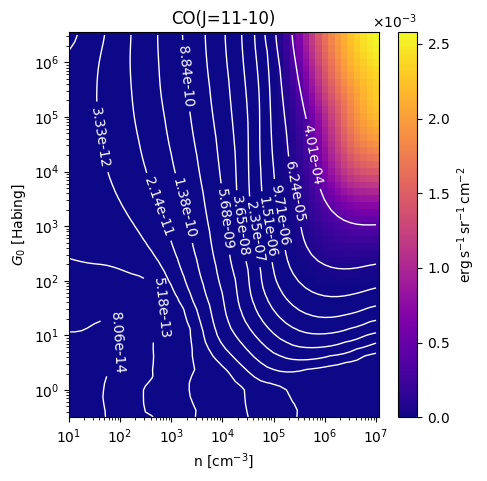 CO(J=11-10) Intensity emitted from the surface of a PDR as a function of the cloud density n and the FUV flux incident on the cloud G0. The above model is at a viewing angle of i=30 degrees, where i=0 is face-on. The models in the wk2020 ModelSet are based on Kaufman et al. 2006 , Wolfire et al. 2010, and Neufeld & Wolfire 2016. They use these parameters. More details are in the FITS headers.