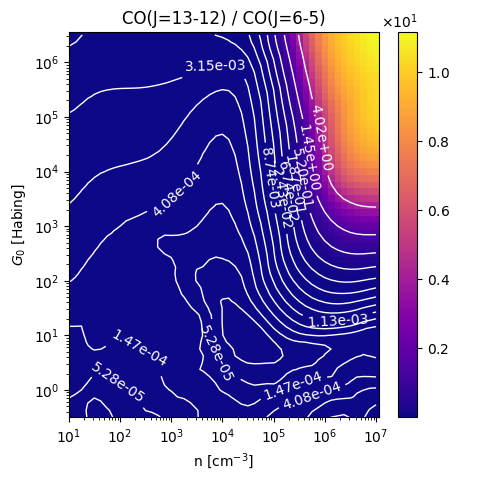 CO(J=13-12) / CO(J=6-5) Intensity Ratio emitted from the surface of a PDR as a function of the cloud density n and the FUV flux incident on the cloud G0. The above model is at a viewing angle of i=30 degrees, where i=0 is face-on. The models in the wk2020 ModelSet are based on Kaufman et al. 2006 , Wolfire et al. 2010, and Neufeld & Wolfire 2016. They use these parameters. More details are in the FITS headers.