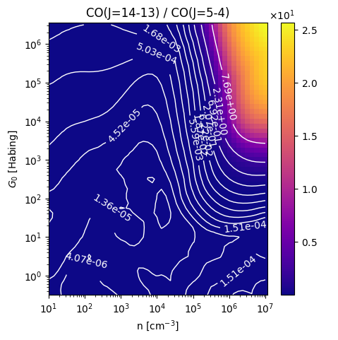 CO(J=14-13) / CO(J=5-4) Intensity Ratio emitted from the surface of a PDR as a function of the cloud density n and the FUV flux incident on the cloud G0. The above model is at a viewing angle of i=30 degrees, where i=0 is face-on. The models in the wk2020 ModelSet are based on Kaufman et al. 2006 , Wolfire et al. 2010, and Neufeld & Wolfire 2016. They use these parameters. More details are in the FITS headers.