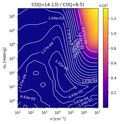 CO(J=14-13) / CO(J=6-5) Intensity Ratio emitted from the surface of a PDR as a function of the cloud density n and the FUV flux incident on the cloud G0. The above model is at a viewing angle of i=30 degrees, where i=0 is face-on. The models in the wk2020 ModelSet are based on Kaufman et al. 2006 , Wolfire et al. 2010, and Neufeld & Wolfire 2016. They use these parameters. More details are in the FITS headers.