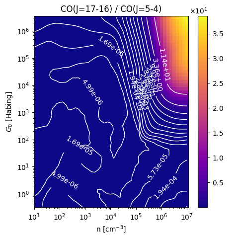 CO(J=17-16) / CO(J=5-4) Intensity Ratio emitted from the surface of a PDR as a function of the cloud density n and the FUV flux incident on the cloud G0. The above model is at a viewing angle of i=30 degrees, where i=0 is face-on. The models in the wk2020 ModelSet are based on Kaufman et al. 2006 , Wolfire et al. 2010, and Neufeld & Wolfire 2016. They use these parameters. More details are in the FITS headers.
