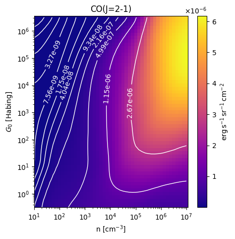 CO(J=2-1) Intensity emitted from the surface of a PDR as a function of the cloud density n and the FUV flux incident on the cloud G0. The above model is at a viewing angle of i=30 degrees, where i=0 is face-on. The models in the wk2020 ModelSet are based on Kaufman et al. 2006 , Wolfire et al. 2010, and Neufeld & Wolfire 2016. They use these parameters. More details are in the FITS headers.