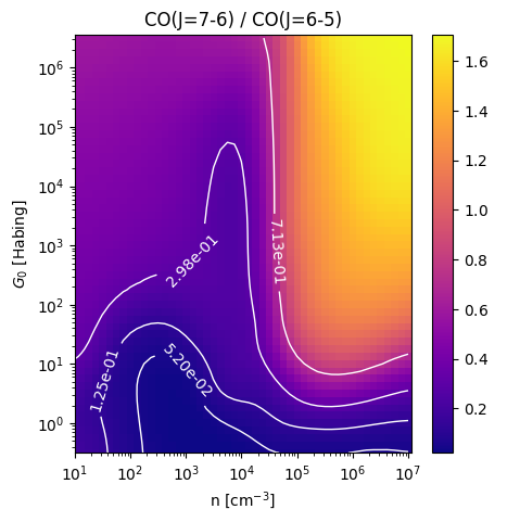 CO(J=7-6) / CO(J=6-5) Intensity Ratio emitted from the surface of a PDR as a function of the cloud density n and the FUV flux incident on the cloud G0. The above model is at a viewing angle of i=30 degrees, where i=0 is face-on. The models in the wk2020 ModelSet are based on Kaufman et al. 2006 , Wolfire et al. 2010, and Neufeld & Wolfire 2016. They use these parameters. More details are in the FITS headers.