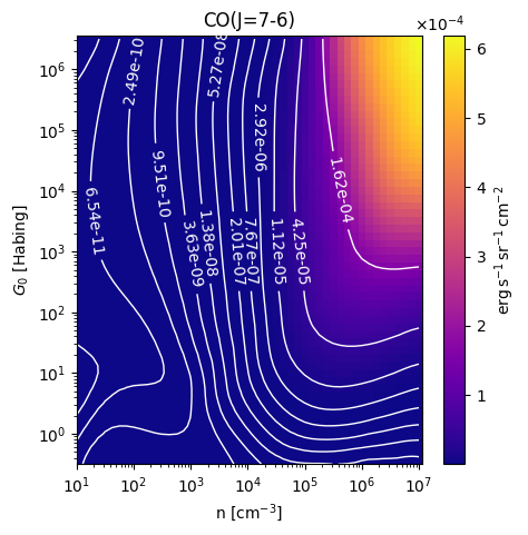 CO(J=7-6) Intensity emitted from the surface of a PDR as a function of the cloud density n and the FUV flux incident on the cloud G0. The above model is at a viewing angle of i=30 degrees, where i=0 is face-on. The models in the wk2020 ModelSet are based on Kaufman et al. 2006 , Wolfire et al. 2010, and Neufeld & Wolfire 2016. They use these parameters. More details are in the FITS headers.