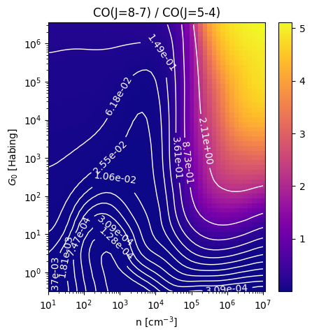 CO(J=8-7) / CO(J=5-4) Intensity Ratio emitted from the surface of a PDR as a function of the cloud density n and the FUV flux incident on the cloud G0. The above model is at a viewing angle of i=30 degrees, where i=0 is face-on. The models in the wk2020 ModelSet are based on Kaufman et al. 2006 , Wolfire et al. 2010, and Neufeld & Wolfire 2016. They use these parameters. More details are in the FITS headers.