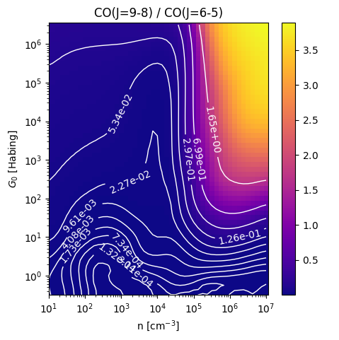 CO(J=9-8) / CO(J=6-5) Intensity Ratio emitted from the surface of a PDR as a function of the cloud density n and the FUV flux incident on the cloud G0. The above model is at a viewing angle of i=30 degrees, where i=0 is face-on. The models in the wk2020 ModelSet are based on Kaufman et al. 2006 , Wolfire et al. 2010, and Neufeld & Wolfire 2016. They use these parameters. More details are in the FITS headers.