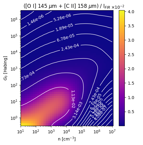 ([O I] 145 µm + [C II] 158 µm) / IFIR Intensity Ratio emitted from the surface of a PDR as a function of the cloud density n and the FUV flux incident on the cloud G0. The above model is at a viewing angle of i=30 degrees, where i=0 is face-on. The models in the wk2020 ModelSet are based on Kaufman et al. 2006 , Wolfire et al. 2010, and Neufeld & Wolfire 2016. They use these parameters. More details are in the FITS headers.
