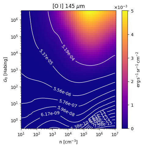 [O I] 145 µm Intensity emitted from the surface of a PDR as a function of the cloud density n and the FUV flux incident on the cloud G0. The above model is at a viewing angle of i=30 degrees, where i=0 is face-on. The models in the wk2020 ModelSet are based on Kaufman et al. 2006 , Wolfire et al. 2010, and Neufeld & Wolfire 2016. They use these parameters. More details are in the FITS headers.