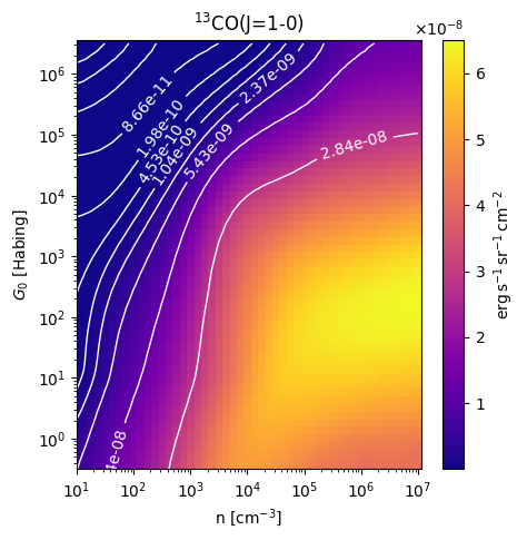 13CO(J=1-0) Intensity emitted from the surface of a PDR as a function of the cloud density n and the FUV flux incident on the cloud G0. The above model is at a viewing angle of i=45 degrees, where i=0 is face-on. The models in the wk2020 ModelSet are based on Kaufman et al. 2006 , Wolfire et al. 2010, and Neufeld & Wolfire 2016. They use these parameters. More details are in the FITS headers.