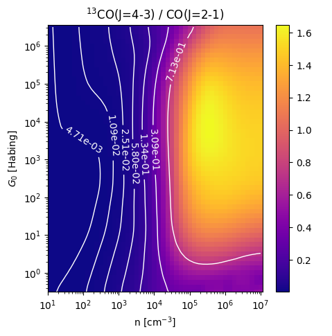 13CO(J=4-3) / CO(J=2-1) Intensity Ratio emitted from the surface of a PDR as a function of the cloud density n and the FUV flux incident on the cloud G0. The above model is at a viewing angle of i=45 degrees, where i=0 is face-on. The models in the wk2020 ModelSet are based on Kaufman et al. 2006 , Wolfire et al. 2010, and Neufeld & Wolfire 2016. They use these parameters. More details are in the FITS headers.