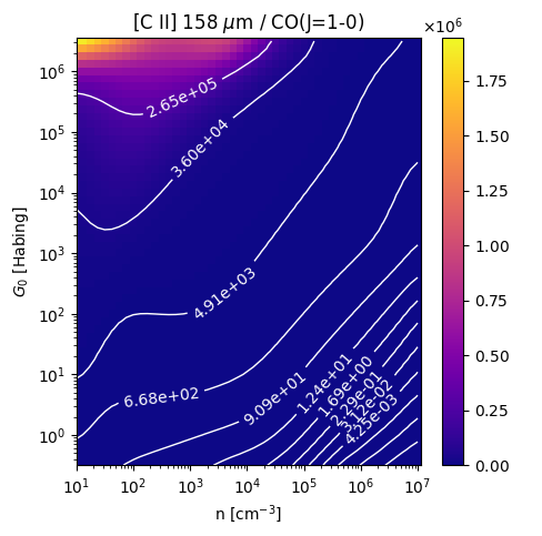 [C II] 158 µm / CO(J=1-0) Intensity Ratio emitted from the surface of a PDR as a function of the cloud density n and the FUV flux incident on the cloud G0. The above model is at a viewing angle of i=45 degrees, where i=0 is face-on. The models in the wk2020 ModelSet are based on Kaufman et al. 2006 , Wolfire et al. 2010, and Neufeld & Wolfire 2016. They use these parameters. More details are in the FITS headers.